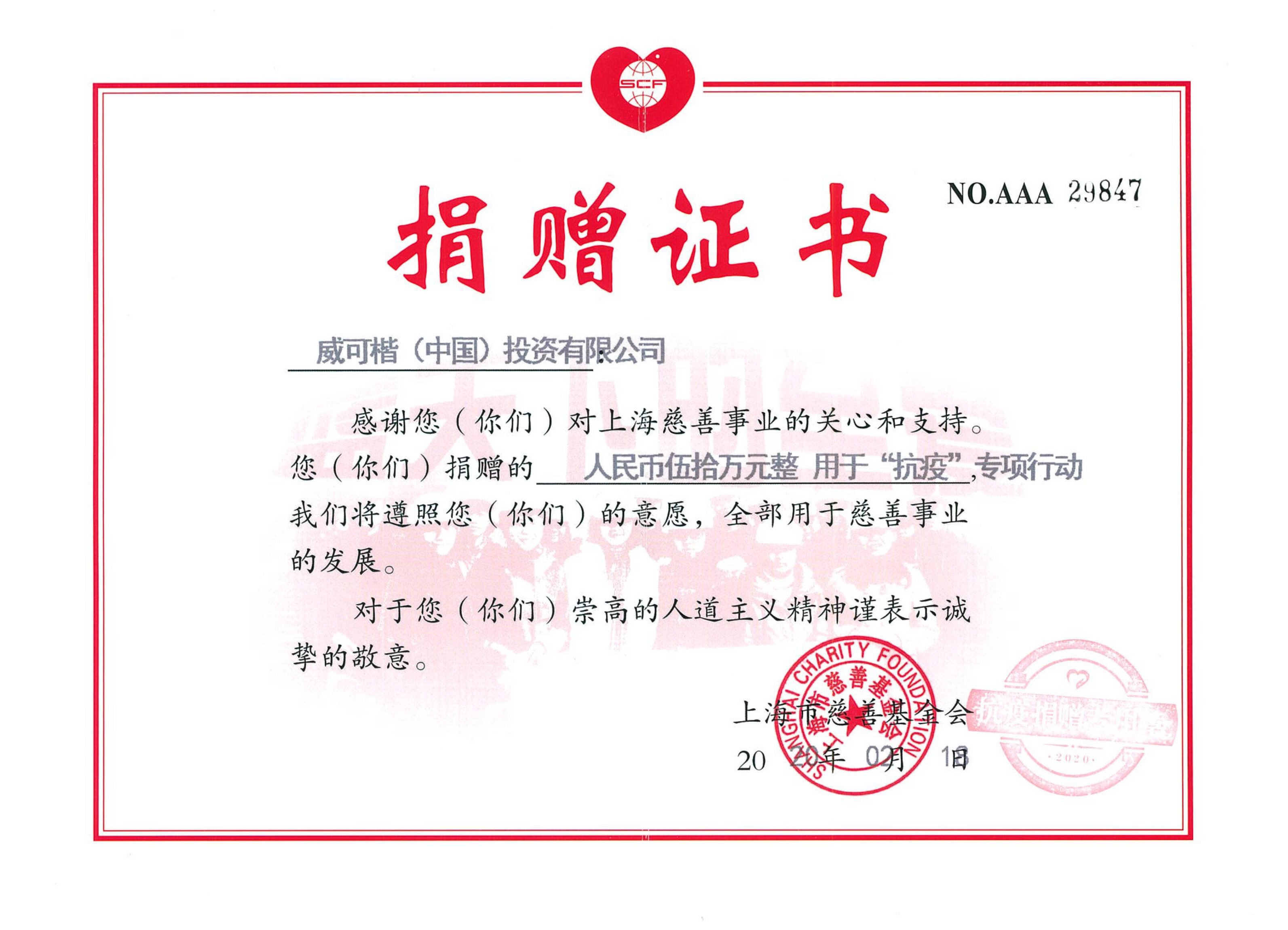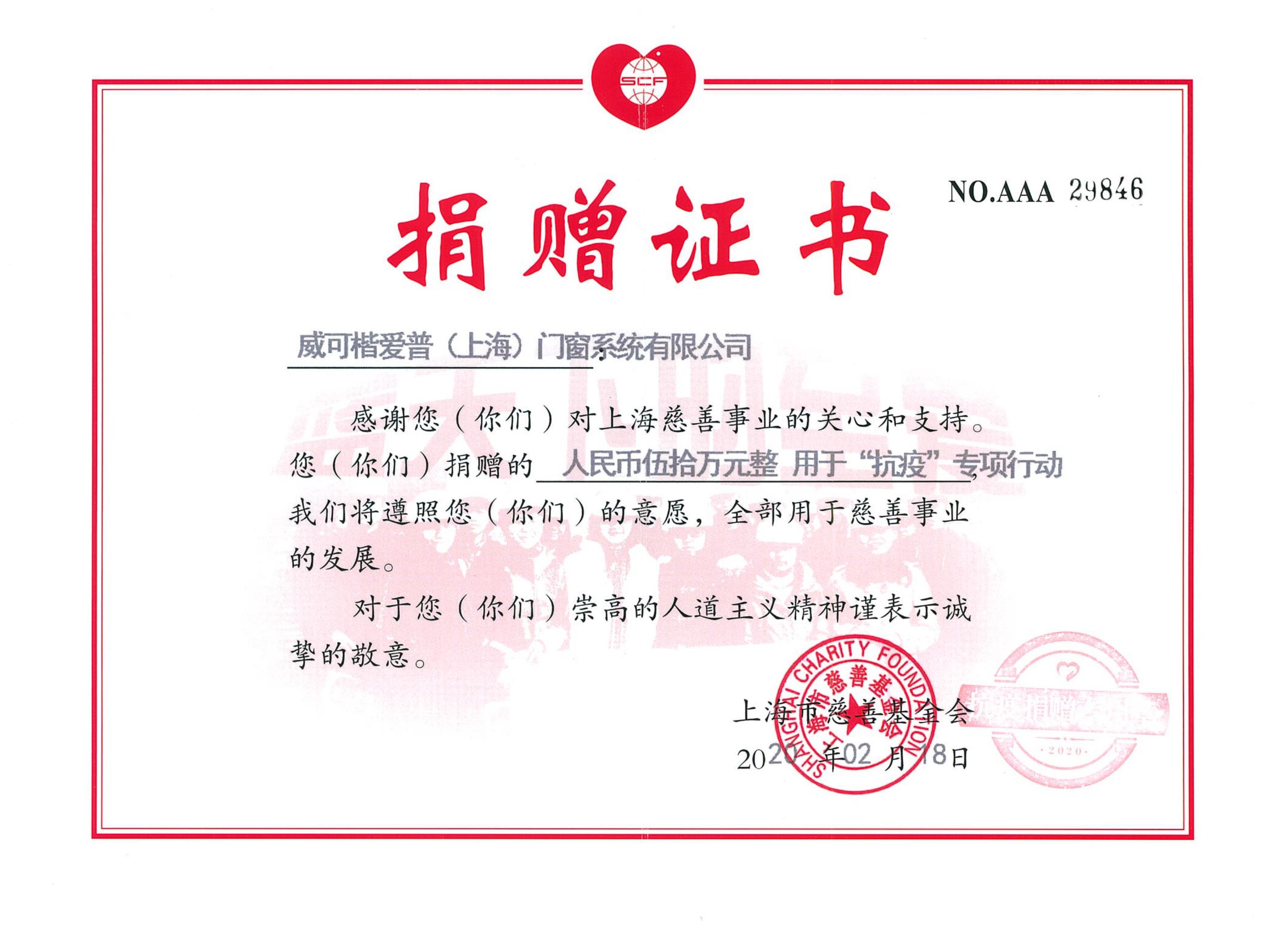 2020年2月17日,威可楷愛(ài)普(上海)門(mén)窗系統(tǒng)有限公司和威可楷(中國(guó))投資有限公司通過(guò)上海市慈善基金會(huì)分別捐款50萬(wàn)元人民幣,總計(jì)100萬(wàn)元人民幣,用于抗擊湖北省新型冠狀病毒肺炎疫情的專(zhuān)項(xiàng)行動(dòng)。在此之前,YKK集團(tuán)下屬的中國(guó)發(fā)斯寧事業(yè)公司捐贈(zèng)了72萬(wàn)根拉鏈用于醫(yī)用防護(hù)服等抗疫物資,為打贏疫情防控狙擊戰(zhàn)貢獻(xiàn)自己的一份力量。