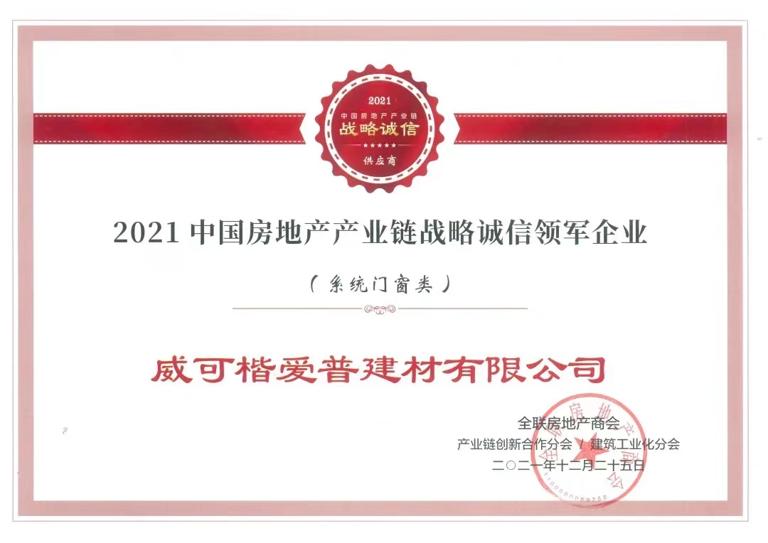 “2021中國房地產產業(yè)鏈戰(zhàn)略誠信領軍企業(yè)”稱號