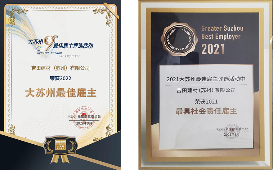 ![]() YKK AP蘇州工廠 榮獲ISO9001認(rèn)證 | ![]() YKK AP蘇州性能實(shí)驗(yàn)室獲得 中國(guó)合格評(píng)定國(guó)家認(rèn)可委員會(huì) 實(shí)驗(yàn)室認(rèn)可證書(shū) | ![]() 在百余家蘇州優(yōu)質(zhì)企業(yè)中脫穎而出榮獲“大蘇州最佳雇主”、 “最具社會(huì)責(zé)任雇主” |
