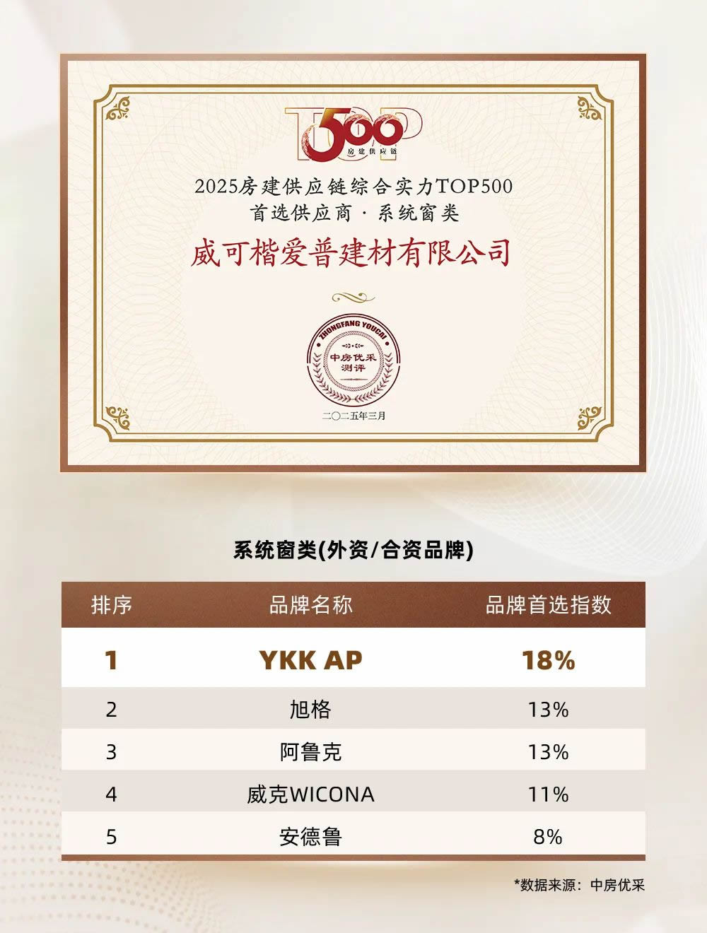 YKK AP憑借不凡的門窗建材實(shí)力,以18%品牌首選指數(shù)入選房建供應(yīng)鏈綜合實(shí)力TOP500首選供應(yīng)商·系統(tǒng)門窗類(外資/合資品牌)排名第一
