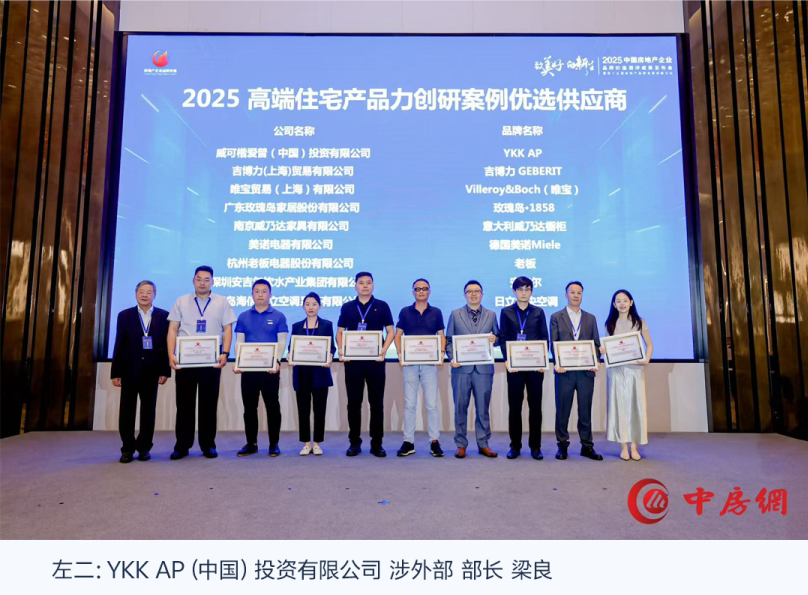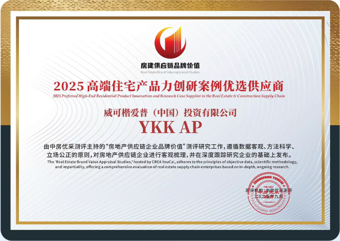 在這份報告的嚴(yán)格評選中,YKK AP依托扎實的產(chǎn)品品質(zhì)、深厚的行業(yè)積淀、穩(wěn)定的合作口碑及項目落地能力等多個維度的核心優(yōu)勢,榮獲“2025高端住宅產(chǎn)品力創(chuàng)研案例優(yōu)選供應(yīng)商” 稱號。
