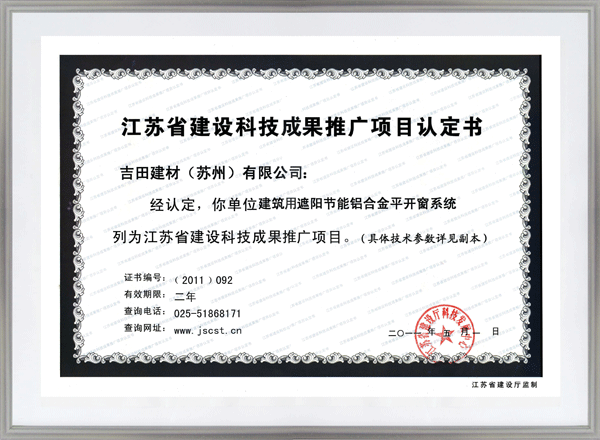 2011年4月21日受住房和城鄉(xiāng)建設(shè)廳的委托,江蘇省住建廳科技發(fā)展中心在蘇州市組織召開了YKK AP公司的“建筑用遮陽節(jié)能鋁合金平開窗系統(tǒng)”技術(shù)評(píng)估會(huì)。經(jīng)過評(píng)估委員會(huì)認(rèn)真詳細(xì)的評(píng)定,一致通過YKK AP自主研發(fā)設(shè)計(jì)的“建筑用遮陽節(jié)能鋁合金平開窗系統(tǒng)”為江蘇省建設(shè)科技成果推廣項(xiàng)目!