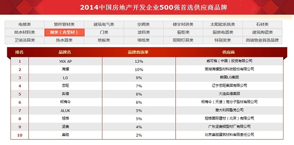本次測評活動由中國房地產(chǎn)研究會、中國房地產(chǎn)業(yè)協(xié)會、中國房地產(chǎn)測評中心聯(lián)合舉辦,至今已是第六屆,在業(yè)內(nèi)的知名度及權(quán)威性有目共睹。根據(jù)會上發(fā)布的《2014中國房地產(chǎn)開發(fā)企業(yè)500強首選品牌測評研究報告》,YKK AP以12%的品牌首選率蟬聯(lián)窗類評選的榜首;從區(qū)域分布而言,YKK AP更是以10%、15%、14%、12%的首選率分別榮登華北、華中、華東、東北四大區(qū)域的第一位。