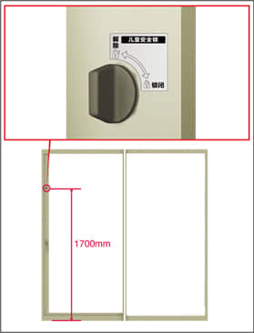 兒童鎖的標(biāo)準(zhǔn)設(shè)置高度為1700mm,在推拉門關(guān)閉后,開啟兒童鎖可實(shí)現(xiàn)二次鎖定,切實(shí)地提供安全雙保障。 ※ 根據(jù)具體尺寸不同,兒童鎖的高度會(huì)有所調(diào)整。