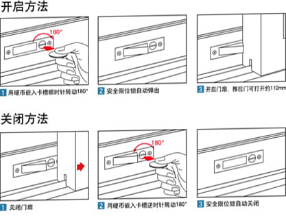 打開安全限位鎖,推拉門窗可開啟約110mm的縫隙,進(jìn)而實(shí)現(xiàn)微通風(fēng)的功能。同時(shí)可有效防止他人進(jìn)出,創(chuàng)造安心安全的舒適生活。 ※ 安全限位鎖可安裝于扇的下框型材上